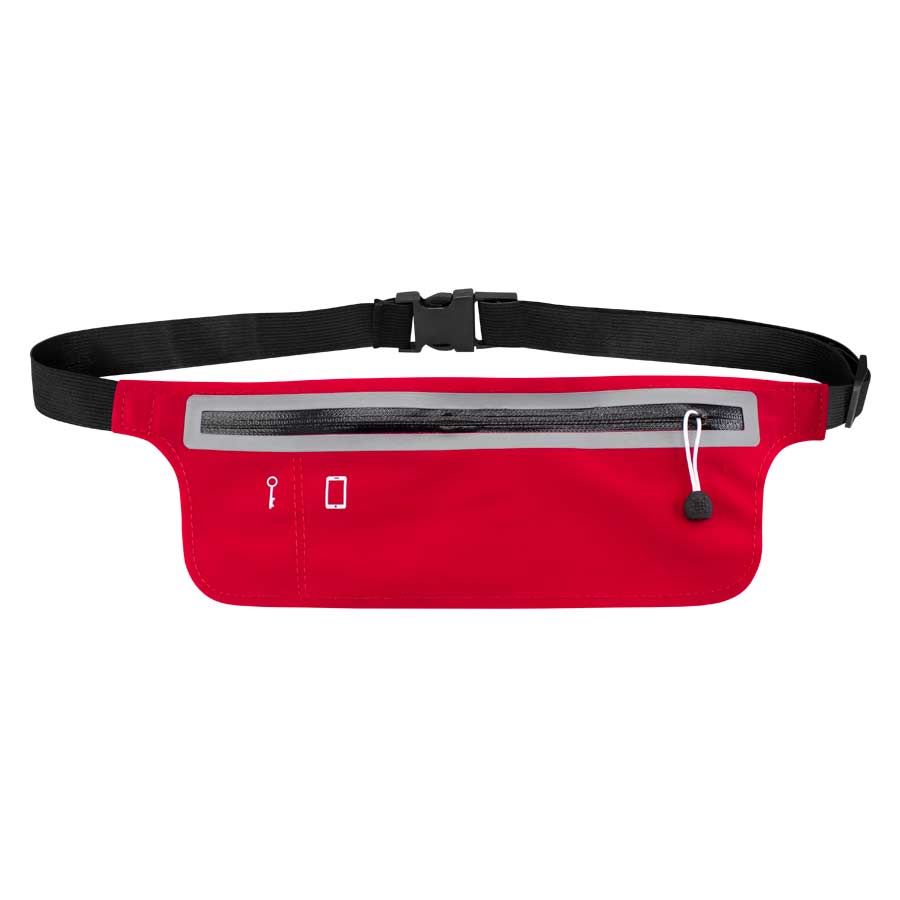 Banano impermeable, en tela Polyester Stretch 210 Waterproof. Incluye banda-cinturón elasticado ajustable color negro, bandas reflectantes color plateado, cierre-eclair impermeable y doble compartimento, uno para smart-phone, otro para accesorios como llaves o monedas.