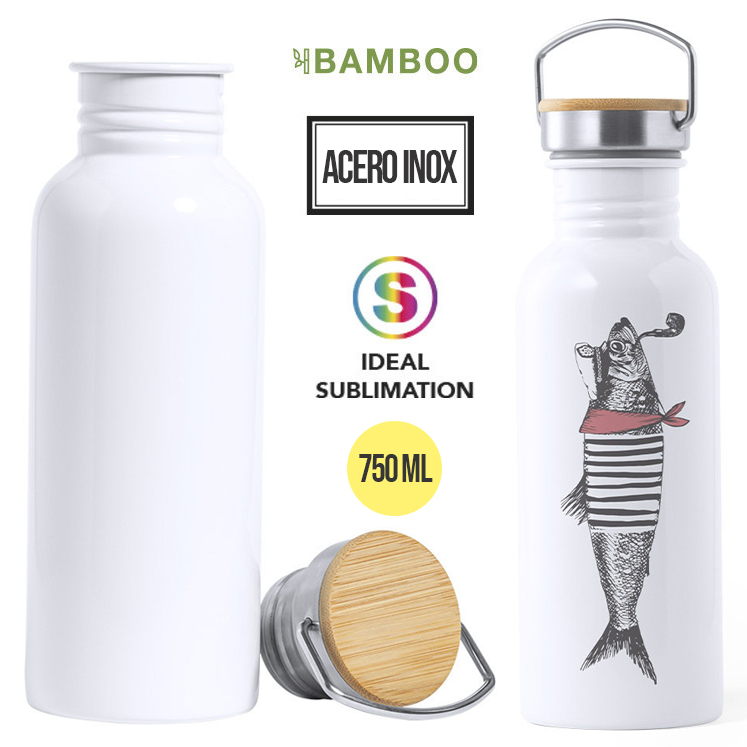 Bidón en acero inox especialmente diseñado para marcaje en sublimación. De estilo retro y 750ml de capacidad. Tapón de seguridad a rosca en acero inox, con detalle en bambú y asa de transporte vintage. Presentado en atractiva caja de diseño. 750 ml