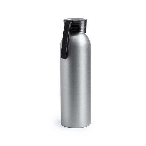 Bidón de aluminio de 650 ml de capacidad. Cuerpo en color plateado, con tapón de seguridad a rosca en variada gama de colores transparentes. Cinta de transporte en material TPR a juego. 650 ml