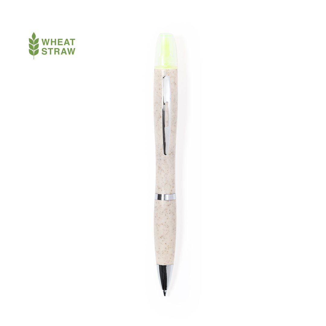 Práctico bolígrafo fabricado en caña de trigo y ABS con marcador incluido. De mecanismo giratorio y en tinta azul. En la parte superior incluye un útil marcador amarillo fluorescente con capucha. Logotipo Wheat Straw en la parte superior del bolígrafo, con clip y accesorios metálicos, y cuerpo color natural. La caña de trigo fomenta la utilización de materias primas naturales, reduciendo así las emisiones contaminantes. Marcador Incluido