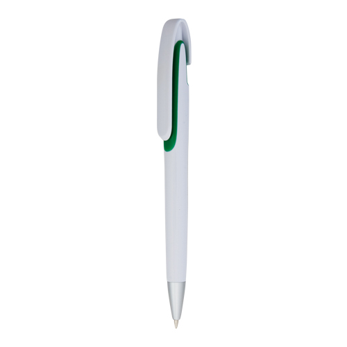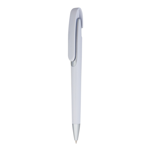 Bolígrafo de mecanismo pulsador de atrevido diseño tricolor con accesorios en vivos colores y cuerpo de suave acabado en color blanco sólido. Con original clip curvado a juego y cómoda empuñadura. Tinta azul.