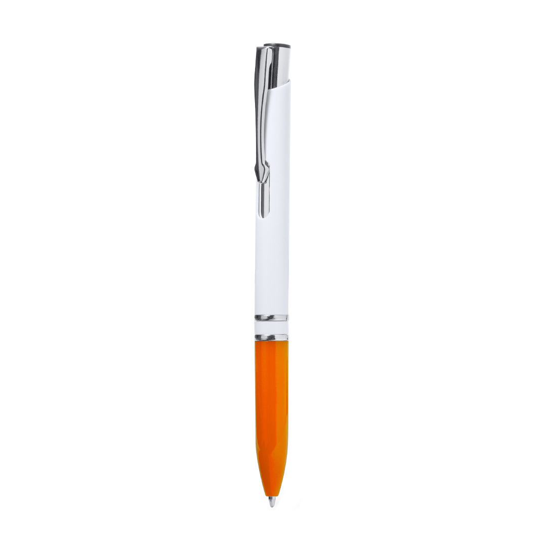Elegante bolígrafo con mecanismo pulsador. Con cuerpo acabado en color blanco brillo y empuñadura en variada gama colores. Fabricado en resistente ABS acabado brillo. Con carga jumbo y tinta azul. Carga Jumbo