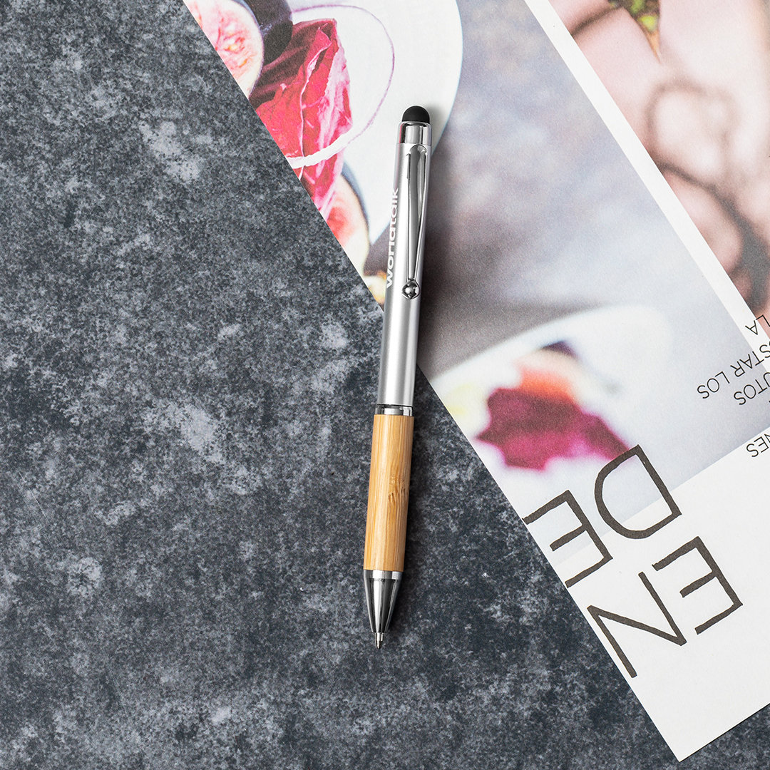 Elegante bolígrafo puntero de línea nature y mecanismo giratorio. Cuerpo en resistente ABS de acabado brillo y empuñadura en bambú, con accesorios a juego. Clip metálico y en tinta azul.