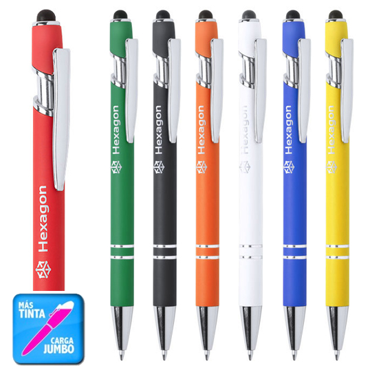 Bolígrafo puntero de mecanismo pulsador y original diseño. Cuerpo de aluminio acabado goma, especialmente diseñado para marcaje en láser y mostrar el logotipo en tono plateado. Con accesorios cromados y clip metálico. Disponible en variada gama de colores, con cartucho jumbo y tinta azul. Carga Jumbo