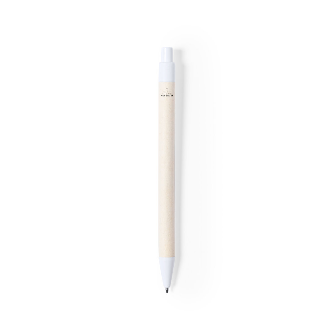Bolígrafo de línea nature, con cuerpo fabricado con cartones de leche reciclados y detalles en color blanco. De mecanismo pulsador y en tinta azul, con distintivo cartón de leche reciclado en el cuerpo. Los cartones de leche se componen en su mayor parte de cartón y aluminio. Durante su proceso de reciclado, se separan los distintos materiales del envase para su reutilización y nuevo uso, contribuyendo así a recorrer el camino infinito de la economía circular. Este material se caracteriza por su alto grado de reciclabilidad, así como por su ligereza y resistencia.