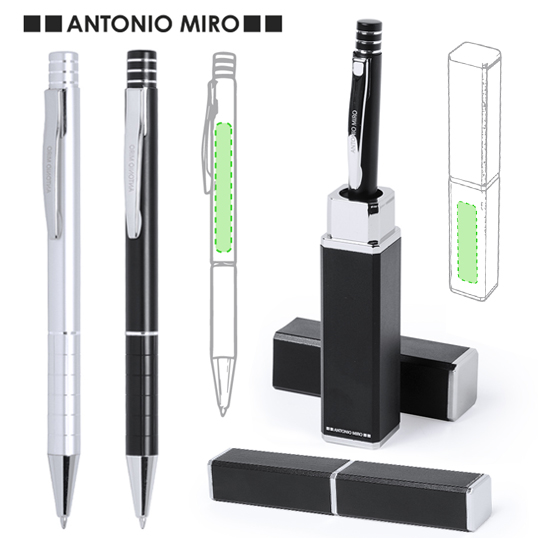 Bolígrafo de Antonio Miró de elegante diseño y suave cuerpo en aluminio con accesorios en color plateado. De mecanismo giratorio, con parte superior anillada, original clip metálico y presentado en estuche individual de aluminio negro con logotipo de la marca. Tinta azul.