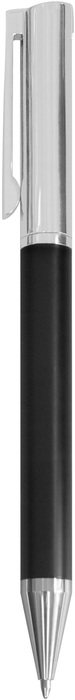 Metálico. Bolígrafo con apertura giratoria. Destape acero en la parte superior e inferior. Cuerpo color negro. Clip, tambor superior y puntera color plata. Tinta azul. Presentación en estuche con cierre magnético.