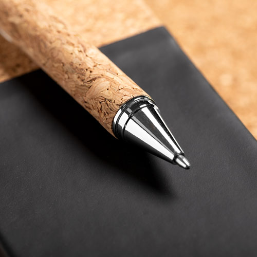Bolígrafo de línea nature con cuerpo en corcho natural. Clip, punta y parte superior metálicos, con acabado cromado. De mecanismo giratorio, cartucho jumbo y con tinta azul. En estuche individual de polipiel con detalle en corcho e interior en suave antelina. Presentado en estuche de cartón negro.
