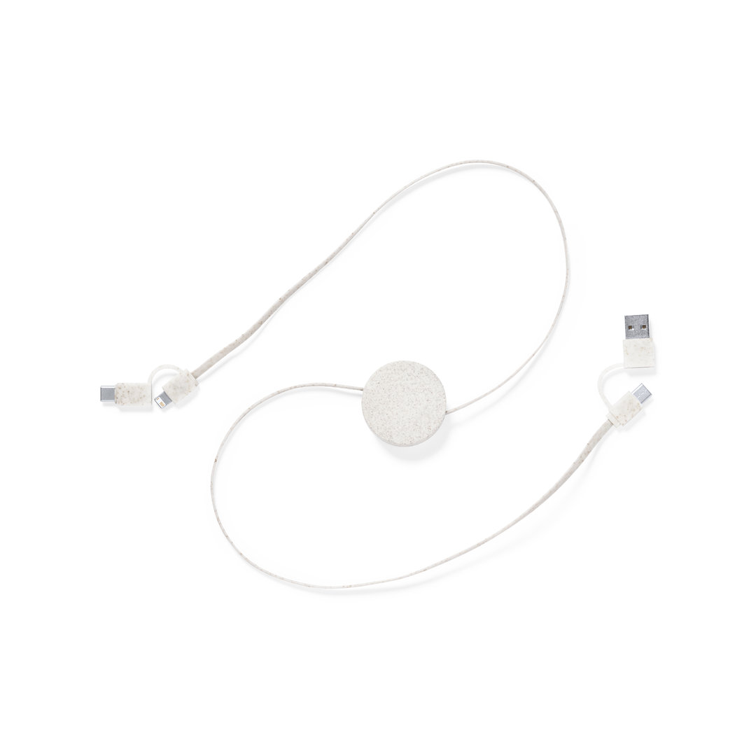 Cable cargador y sincronizador extensible, válido para cargar dispositivos y transferir datos. Fabricado en caña de trigo, para así fomentar la utilización de materias primas naturales y reducir las emisiones contaminantes. Pieza central con mecanismo interior extensible. Incluidas conexiones de entrada Tipo C y USB salidas Lightning, Micro USB y Tipo C. 5V DC 2.4A. Presentado en bolsa individual de diseño kraft. Apto para transferir datos. Cable Extensible. Conexión Micro USB, Tipo C y Lightning 9V DC 2.1A