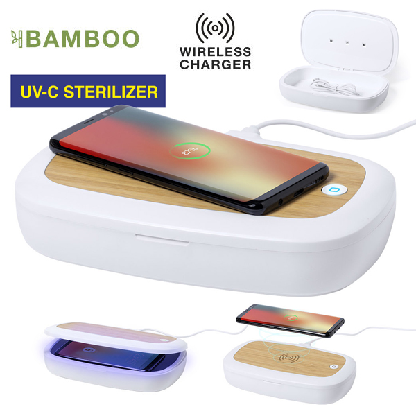 Caja esterilizadora de línea nature, con base de carga en bambú. Luz ultravioleta tipo C, con cargador inalámbrico 5W para smartphone integrado en tapa. Especialmente diseñada para la eliminación de microorganismos y bacterias en objetos de uso cotidiano como el smartphone, llaves, gafas, mascarilla, auriculares, smartwatch... Fabricada en resistente material ABS de acabado mate y presentada en atractiva caja individual de diseño. Fácil de usar, basta con introducir el objeto dentro de la caja. Potencia de bombilla 1W longitud de onda de 270-280 nm, con alimentación mediante cable USB Tipo C de 1m de largo con color a juego. Tiempo de esterilización de 5 y 10 minutos con función auto-apagado. Disponible manual de usuario en español e inglés. Disponible certificación CE, RoHS y de efectividad germicida. Inalámbrico 5W. Luz Ultravioleta. Conexión USB