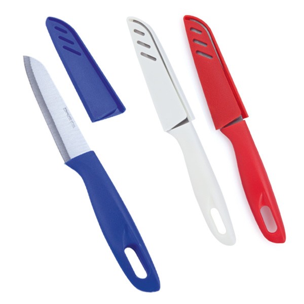 Cuchillo con hoja en acero inox y mango ergonómico troquelado. Funda de seguridad para cuchilla a juego.