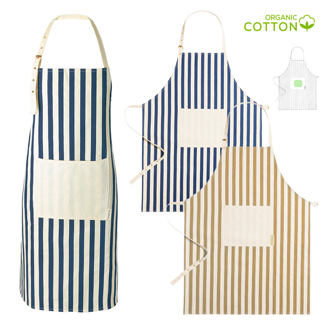 Delantal de línea nature fabricado en material 100% algodón orgánico, cultivado usando métodos sostenibles, sin insecticidas, fertilizante u otros productos químicos, favoreciendo así el cuidado del medio ambiente. Con certificación GOTS (Global Organic Textile Standard, ó Norma Mundial de Textiles Orgánicos) que garantiza que los tejidos están hechos de fibras orgánicas. De innovador diseño a rayas verticales, con bolsillo frontal en color natural y de corte por debajo de la rodilla. Ajustable, con cintas en cuello y cintura. Distintivo algodón orgánico en etiqueta.