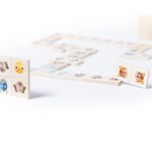 Divertido dominó de animalitos en madera. Con 28 piezas de madera y presentado en estuche de madera con tapa. 28 Piezas