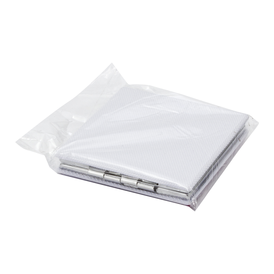 Espejo metálico cuadrado doble, con 2 tapas exteriores recubiertas en poliéster color blanco, para Sublimación. Contiene un espejo normal y el otro con aumento. Sistema de cierre magnético. Presentación en bolsa PP translúcido.