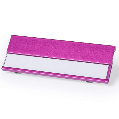 Identificador de aluminio en vivos colores y pinza trasera de enganche para una fijación segura.
