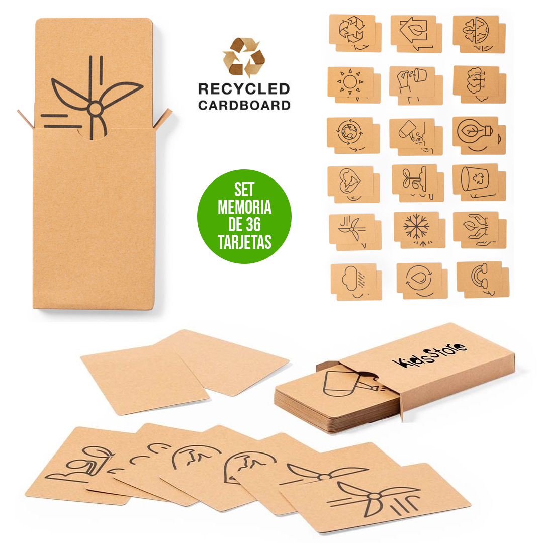 Juego de concienciación ecológica fabricado en cartón reciclado. Set de 36 tarjetas en caja individual de cartón reciclado. 36 Piezas