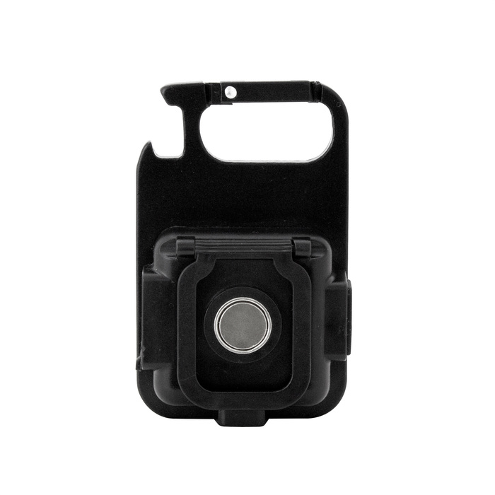 Linterna portátil recargable. Con destapador y mosquetón incorporado. Imán al dorso y soporte con pie para diferentes posiciones. Luz led de alta potencia: 3 intensidades de iluminación (alta, baja e intermitente). Batería recargable de 300 mAh. Luz led indicadora de carga. Puerto USB-C y cable de carga de 30 cm de largo color negro.