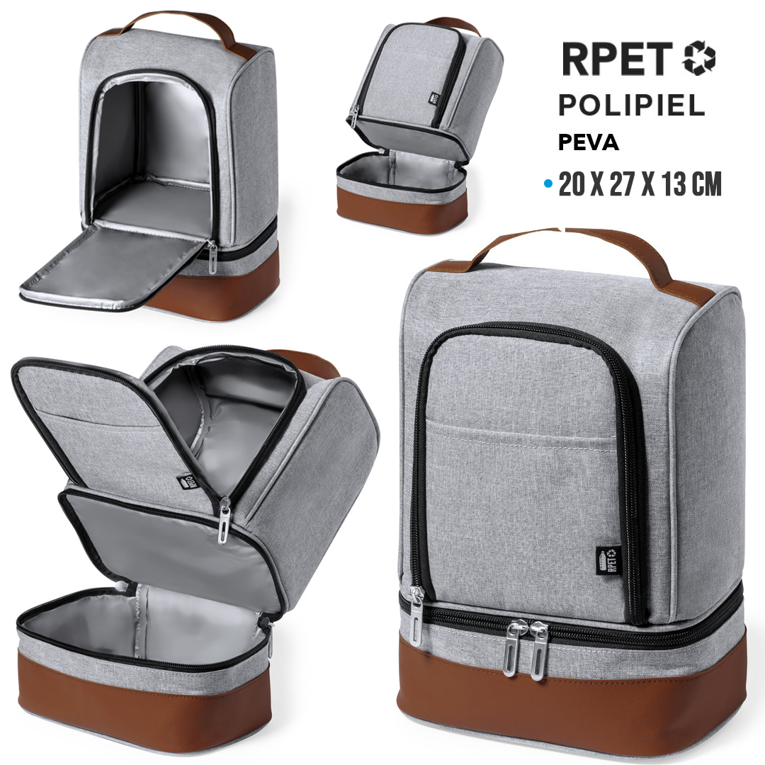 Nevera fabricada en resistente 600D RPET. Acabado en color gris, con base y asa de transporte en polipiel marrón. Incluye 2 compartimentos independientes, con cierre de cremallera y tiradores metálicos. Interior isotermo en PEVA y etiqueta exterior con distintivo RPET.El material RPET se elabora a partir de plástico reciclado, para así fomentar la reutilización de residuos plásticos y ayudar a la sostenibilidad del planeta.