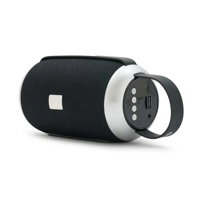 Parlante portátil Bluetooth de color negro con detalles en gris. Cuenta con una correa de agarre y una base que proporciona un mejor apoyo y estabilidad al usarlo en diversas superficies.