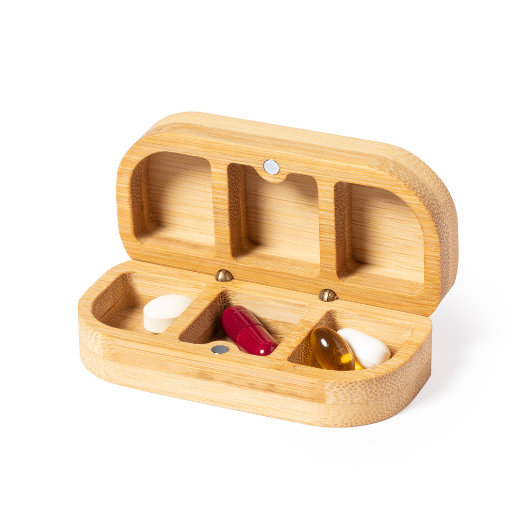 Pastillero de línea nature fabricado en bambú. Con 3 compartimentos interiores y cierre magnético. 3 Compartimentos