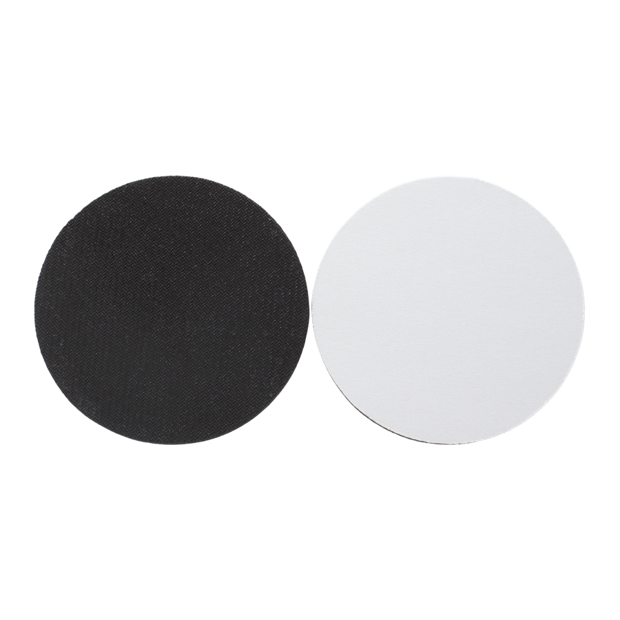 Posavaso redondo de 5mm de espesor y 10cm. de diámetro, con base de silicona negra y cubierta de tela poliéster blanco para Sublimación.