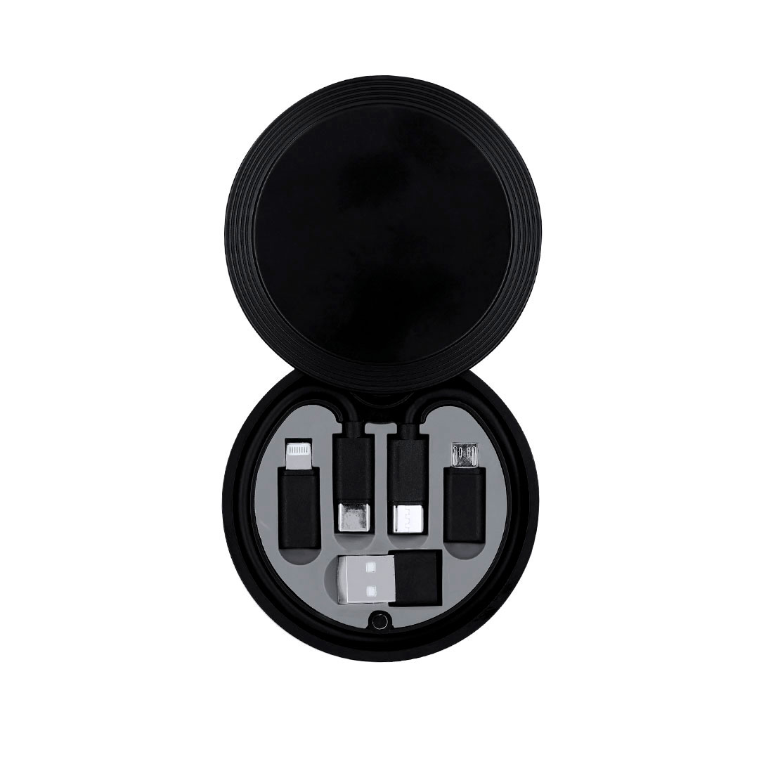 Set de cables cargadores en ABS. Incluye: Cable Tipo-C, adaptador USB, adaptador Micro USB y Adaptador 2 en 1 (Micro USB y Lightning). Presentado en estuche con mosquetón. Apto para transferir datos. Conexión Micro USB, Tipo C y Lightning 5V DC 3A