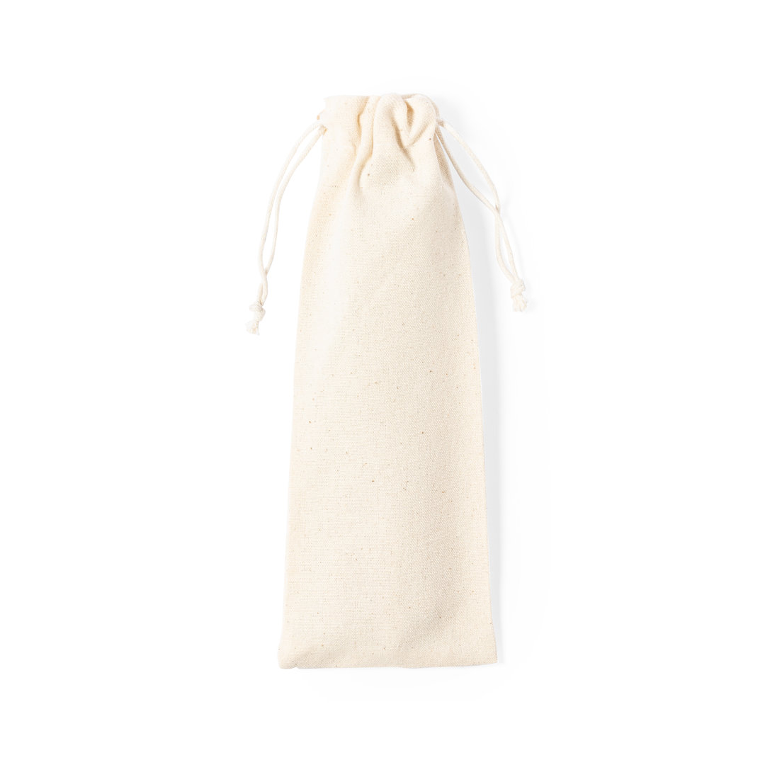 Set de cubiertos de 5 piezas fabricados en acero inox, con mango en madera natural. Incluye cuchara, tenedor, cuchillo, pajita reutilizable y cepillo limpiador para la pajita. Presentación en funda de algodón natural con cordón de cierre. 5 Piezas. Funda Canvas