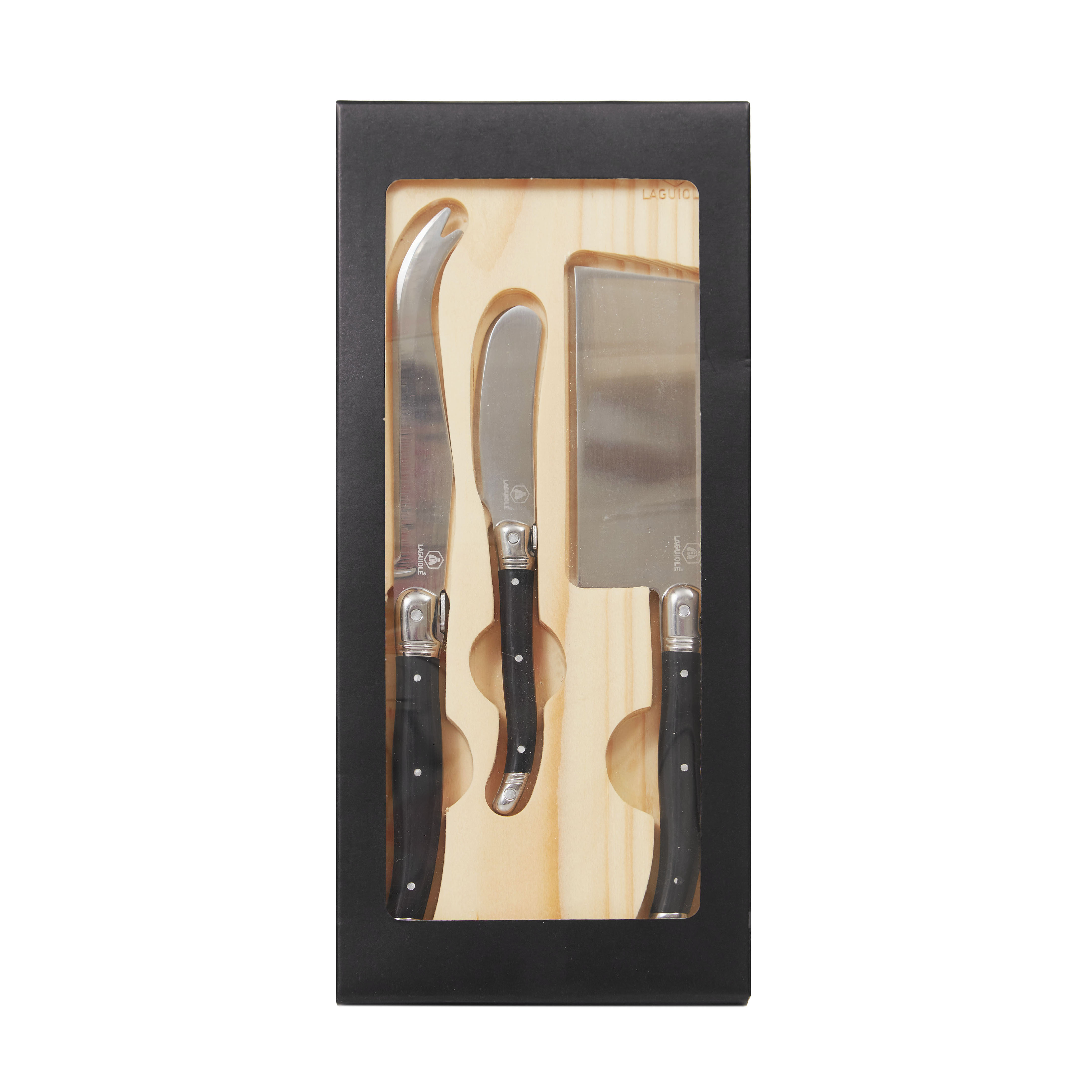 Set de queso de diseño francés con 3 utensillos de distintos tamaños. Los mismos vienen en una cuna de madera. Packaging: caja rígida de cartón laminada, la cual posee una ventana de cristal PVC. Medidas de la caja: 31 x 16 x 6 cm. Producto libre de BPA. Laguiole