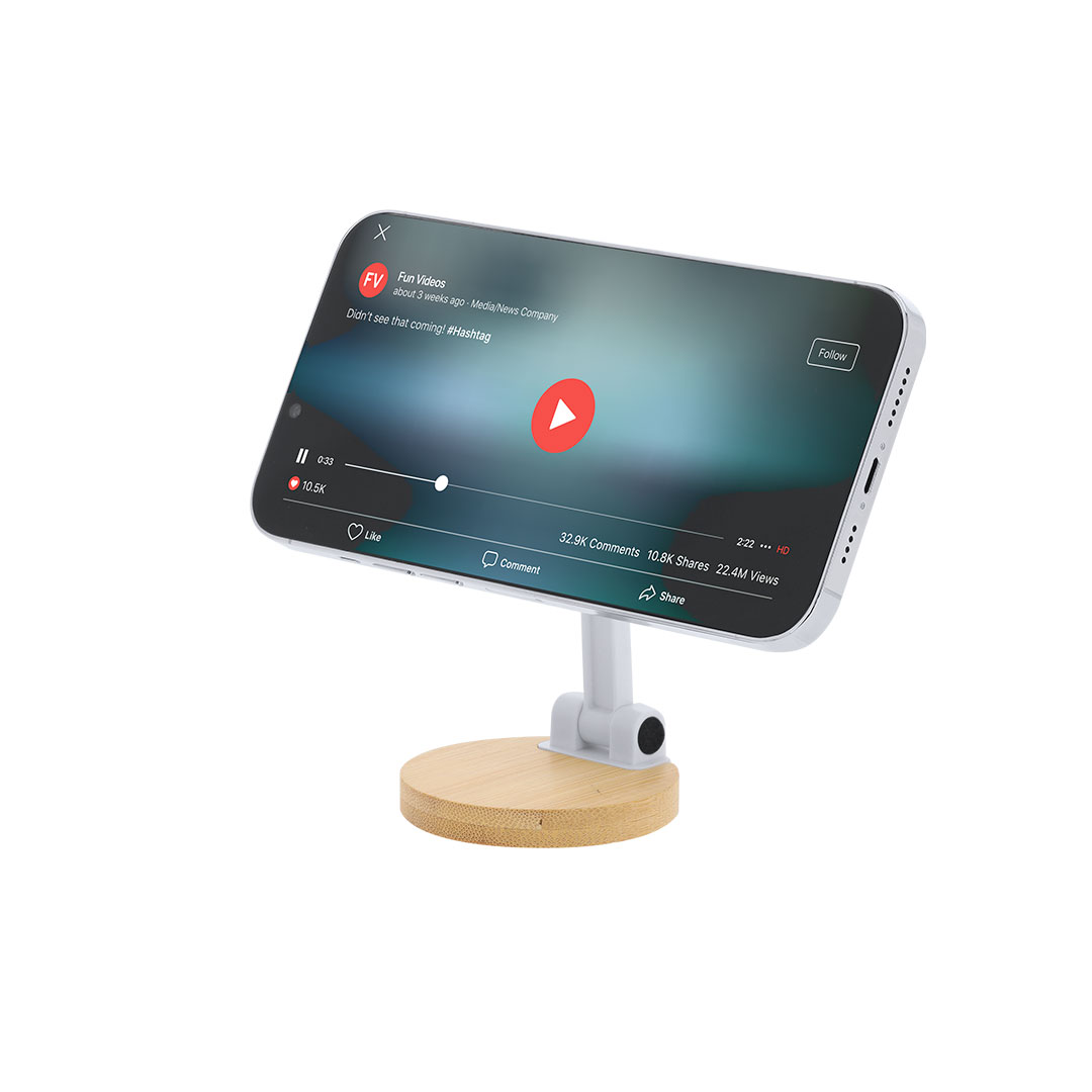 Soporte plegable para smartphones. Con fijación magnética, MagSafe y posición ajustable para mayor comodidad. Incluye anillo metálico adhesivo.Materiales como el bambú fomentan la utilización de materias primas naturales, reduciendo las emisiones contaminantes. Proviene de una planta de gran resistencia y versatilidad, con crecimiento y regeneración rápidos, siendo una excelente alternativa al uso de madera tradicional. Magnético. Plegable. Altura Regulable