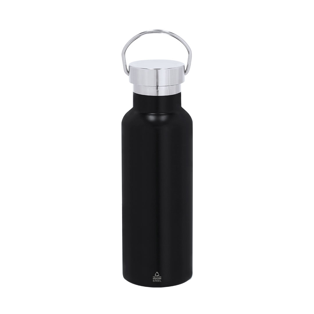 Bidón termo en Acero Inox Reciclado de 500 ml de capacidad. Con doble pared para mejor y más duradera conservación de la temperatura e interior con recubrimiento de cerámica, apto para bebidas carbonatadas. Tapón a rosca con sólida asa de trasporte en acero pulido. Con distintivo de Acero Inox Reciclado.El acero es uno de los materiales más demandados y que puede encontrarse casi en todas partes, desde productos de uso diario a grandes construcciones. Con innumerables propiedades, entre las que cabe destacar la durabilidad y su alto grado de reutilización, convirtiéndolo en una alternativa muy valorada en soluciones de sostenibilidad. Debidamente tratado, permite obtener nuevos recursos de infinita utilización. 500 ml