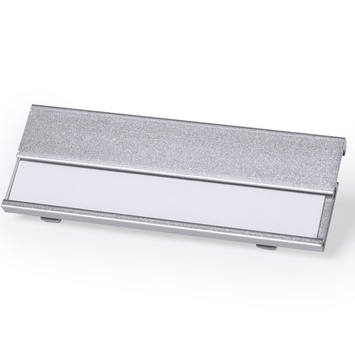 Identificador de aluminio en vivos colores y pinza trasera de enganche para una fijación segura.