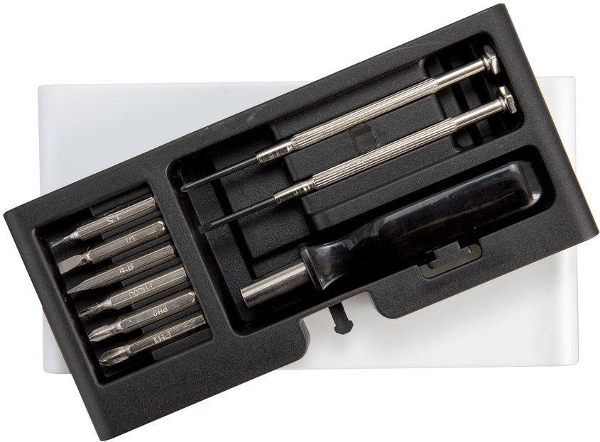 Set de destornilladores. Incluye: 1 mango con punta imantada, 6 puntas diferentes (3 planas: 1,5 ; 3 y 4 mm. y 3 cruz: 0000, 0 y 1mm.) y 2 destornilladores de precisión (1 plano y 1 cruz). Base imantada que permite mantener ordenadas las diferentes puntas. Apertura push.